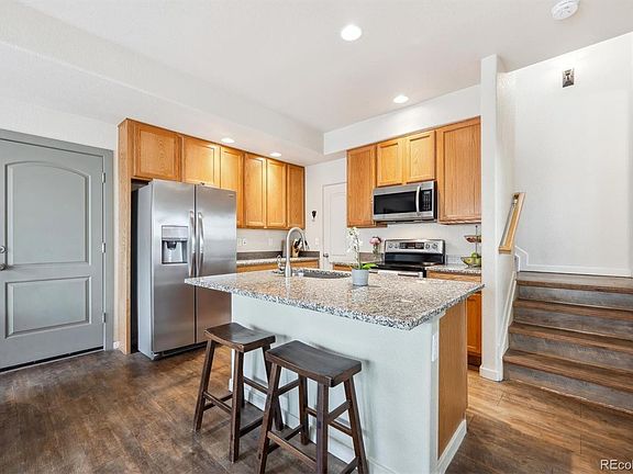 Discover your new oasis in this beautifully appointed two-bedroom townhome, nestled in a private courtyard located near parks, trails, recreation center and shopping. Step inside to an inviting open-concept living space, complete with a cozy gas fireplace and a half bath—perfect for entertaining. The updated kitchen boasts sleek granite counters, stainless steel appliances, a convenient island with a sink and a spacious walk-in pantry. Enjoy seamless indoor-outdoor living with easy access to your private patio through sliding glass doors. The second floor offers two generously sized bedrooms, a full shared bathroom, a study alcove, and a laundry room equipped with a full-size front-load washer and dryer. The attached garage accommodates two vehicles and provides ample storage space. Recent updates include stylish vinyl flooring, a high-efficiency air handler, a Nest thermostat and security system and a Yale keyless front door lock. With an HOA that handles landscaping, snow removal, and covers water and sewer, you'll enjoy a low-maintenance lifestyle. Located in the Denver Public Schools district, with highly rated elementary, middle and high school options in the neighborhood. This townhome is also just moments away from vibrant dining and shopping options at Eastbridge Town Center and the Stanley Marketplace. Don't miss the chance to make this lock-and-leave townhome your own in Denver’s desirable Central Park neighborhood!
