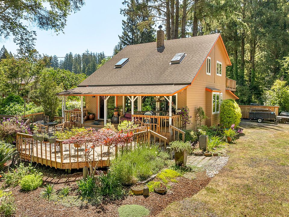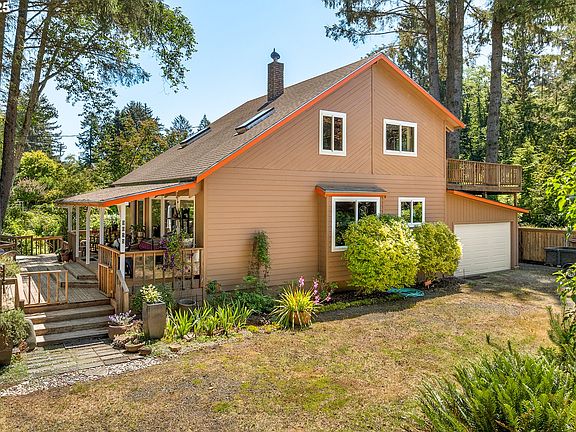 Impressive interior wood finishes throughout this custom home with vaulted ceiling, open living concept living/dining room adorned by Incredibly delightful secluded garden setting with multiple decks, garden areas, bridges over the beautiful Patterson Creek below. Dead end street, adjacent to protected forest area. Enjoy the fire pit, dining on your front deck or convert the rear deck to additional living area. Room for an Assessory Dwelling Unit (ADU). Garage, plenty of on-site parking and full RV hook-up. Newer windows and mini-split heat pump. Oversized lot - 10, 019 SF/.23 Acres. Harvest your huckleberries and mushrooms on site! Even though the home is tucked away on a quiet street, an easy walk to Downtown Bay City for dining, shopping and activities.