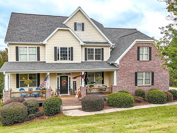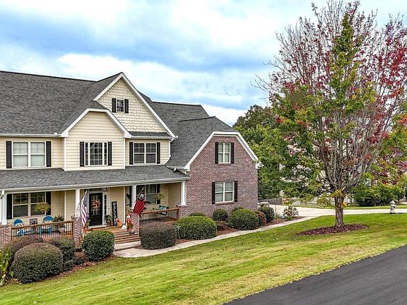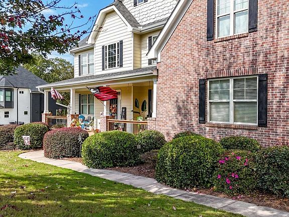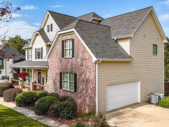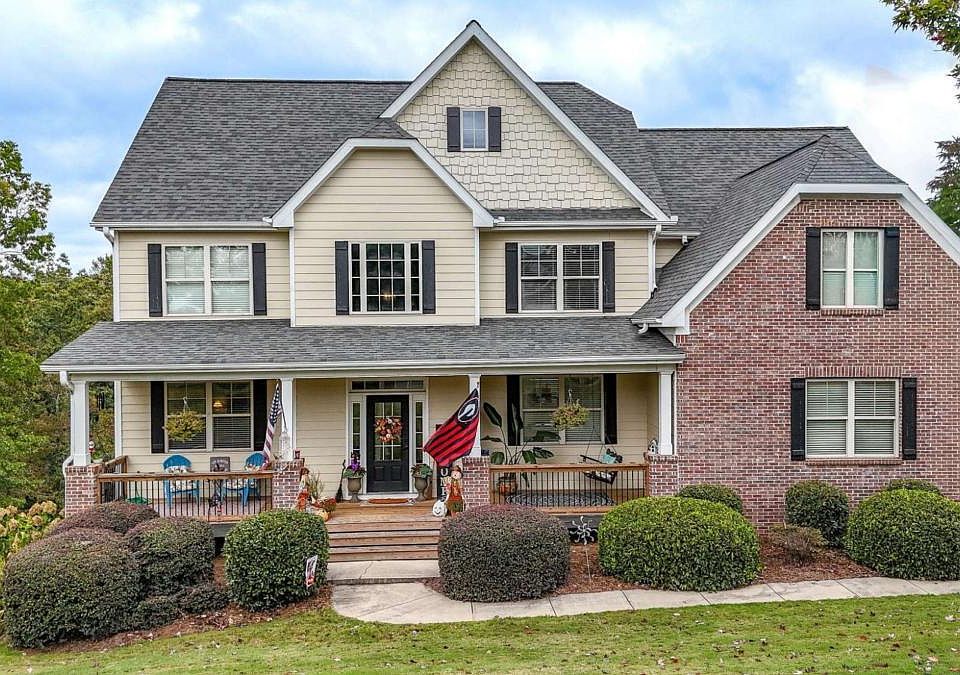 - Conveniently located near Lake Lanier's launch point with direct lake access - Wide concrete pathway curves toward elevated covered front porch with white columns and wooden railings - Black shutters and glass-paneled front door with sidelights - Driveway positioned to the right, leading to side-entry garage -White spindle staircase with wooden handrail - Interior features: white wainscoting, tray ceilings, arched passageways, chandelier-style light fixtures - Living room: black-framed gas log fireplace with white mantel, built-in cabinets, open shelving - Kitchen: central island, granite countertops, cream cabinetry, diamond-pattern tile backsplash, under-cabinet lighting, ceramic tile flooring - Stainless steel appliances: double-door refrigerator, built-in microwave above gas range - Double glass doors off kitchen open to generous outdoor deck - Primary suite: integrated extension for added functionality, dual vanities, built-in soaking tub with wide tile surround, private water closet, walk-in wardrobe with shelving - Low-maintenance landscaping - No HOA-full control over property use and improvements - Expansive unfinished basement with walk-out access, ready for customization