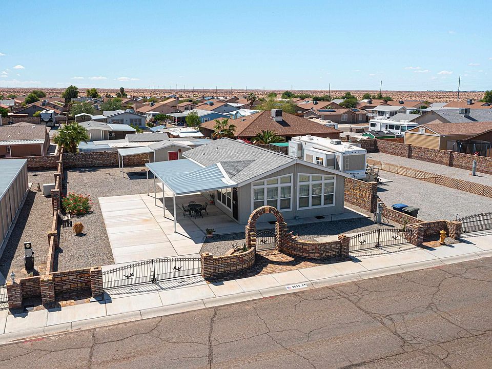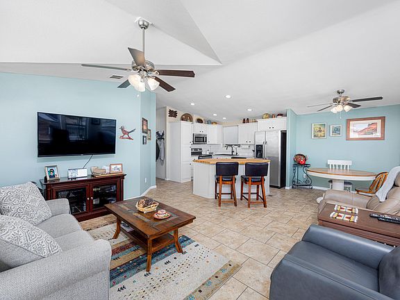 This 2-bedroom, 2-bathroom home offers 1,057 sq. ft. of living space with an open floor plan and vaulted ceilings. The kitchen features a center island with butcher block, a barn sink, and matching stainless steel appliances. Outside, you’ll find a 30-amp RV hook-up with clean out and water, a ground-level wood deck, and a large patio awning. The property also includes a shed with electricity and a small carport, an extra concrete pad, two wrought iron double gates, and a concrete perimeter apron. Additional features include a water softener, making the home well-equipped and functional. The property is in great condition and move-in ready.