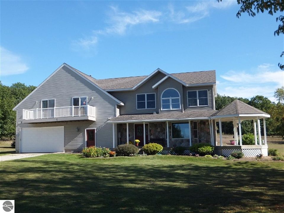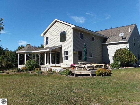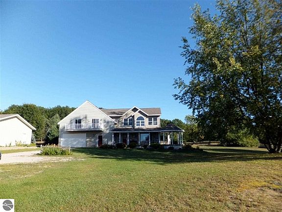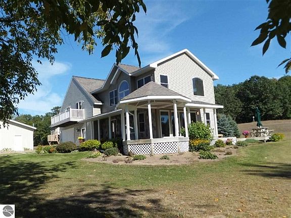 Awesome 10 acre private estate min.s from Sleeping Bear National Shoreline on the northwestern edge of Benzie CO./Leelanau CO line. This wonderful property includes a 3100+ sq ft/4 BR 2.5 BA home, oversized attached garage plus 32x48 pole barn/garage/shop. A gorgeous private mastersuite, lingering westerly sunsets & afternoon sunshine, jet tub, specialized stone & ceramic work. Wrap around covered porch & decking, fountain, scenic views.Welcoming foyer graced by American Cherry floors. Gas fireplace w/cultured stone surround/ gas fireplace. Pellet stove offers efficient heat source. Upstairs living/den area plus bedrooms & attic storage. HI Effic. furnace + Rinnai on demand water heater, central AC, Peerless water conditioner. Plenty of spaces for the entire family & friends! NOTE: Measurements & Sqft accurate but not guaranteed. SEV is not relied on for an estimation of value or future tax projections.