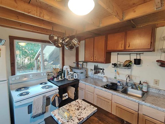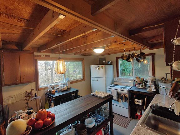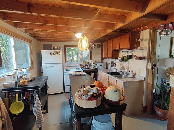 The cabin has an open layout with a large loft bedroom upstairs. Newer flooring and paint throughout. Wood stove and electric baseboards for heat. Washer and dryer included. Bathroom has a shower and bedside commode toilet (no flush toilet). There is a composting outhouse nearby with two separate stalls. Garden space available beside the cabin. Beautiful mature forests that are great for hiking.