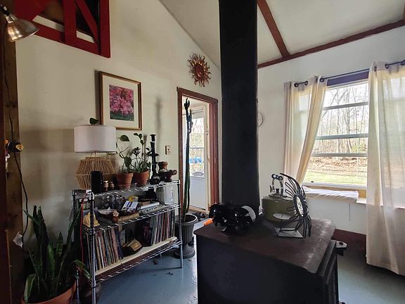 Large loft bedroomOpen layoutElectric baseboards for heatBeautiful mature forestsWood stoveNewer flooring