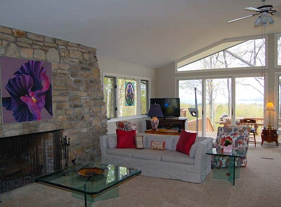 This impeccably maintained year-round cottage is bright and cheery with vaulted ceilings and walls of windows looking out over Ephraim's skyline & Eagle Harbor. The dramatic view from this bluffside perch can be enjoyed from nearly every room as well as the expansive deck & screen porch. The one-story home is freshly painted and has new carpet throughout. It features an open-concept kitchen, dining, living room with fieldstone fireplace, an office with beautiful built ins, a spacious master suite, and ample storage with a walk-in pantry as well as two detached garages. With the entrance to Peninsula State Park just down the street and close proximity to Ephraim & Fish Creek, the location is ideal for enjoying the best of Door County.