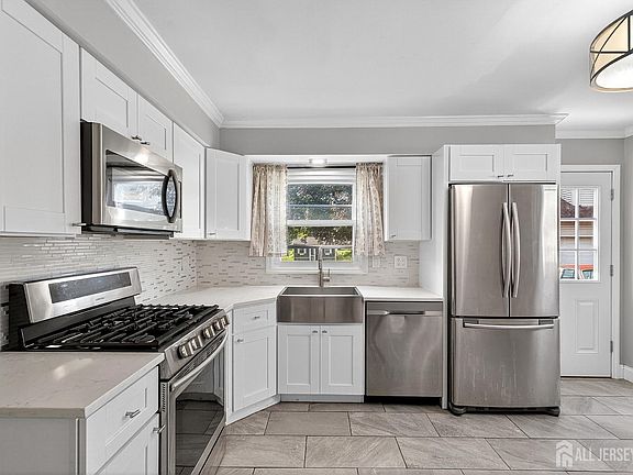 Remodeled and Ready for its new owners this lovely 3-bed, 2.5-bath colonial home on a spacious lot close to transportation, shopping, and restaurants. An invited sitting front porch welcomes you into a bright foyer w/ coat closet, leading into a large living room featuring gleaming hardwood floors, crown molding, & a picture window that fills the space w/ natural light. The living room flows seamlessly into the formal dining room, also showcasing hardwood floors & crown molding. The renovated kitchen is a standout feature, boasting shaker cabinets, quartz countertops, a sleek glass tile backsplash, & tile floor. SS appliances include a French-door refrigerator, 5-burner stove, built-in microwave, undermount dishwasher, & a stylish farmhouse sink. The kitchen also offers direct access to the backyard, making it ideal for entertaining. Spacious family room features beautiful hardwood floors, bay window, 2 large built-in storage benches, crown molding, & access to a second covered porch leading to the backyard. Can also be used as an in-law suite. Upstairs, the large primary bedroom includes hardwood floors, crown molding, a lighted ceiling fan, & 2 WIC w/ built-in organizers. 2nd and 3rd bedrooms are spacious w/ hardwood floors, crown molding, a ceiling fan, & multiple closets w/organizers. The full bathroom has been completely renovated, featuring a shaker vanity w/ marble countertop, double square sinks, decorative mirrors & lighting, crown molding, fully tiled tub/shower w/ glass tile accents & built-in cutouts. A linen closet, window, & vent fan complete the space. The finished basement offers even more living space, including a large carpeted & climate-controlled room, a laundry area w/ utility sink, washer/dryer, & updated HVAC & HWH. There's a full bathroom w/ step-in shower, window, built-in shelving, & closet. A second partially finished room offers Bilco doors opens to the backyard. Outside, enjoy a fenced-in backyard w/ a covered rear porch that steps down to a concrete patio, perfect for outdoor gatherings. The home also features a paver patio & a one-car garage. A wonderful place to call home!