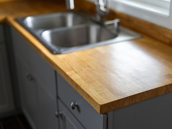 Tile shower surroundCovered porchSmall dining tableButcher block counter topsCeramic flooringNew cabinetsCeiling fan