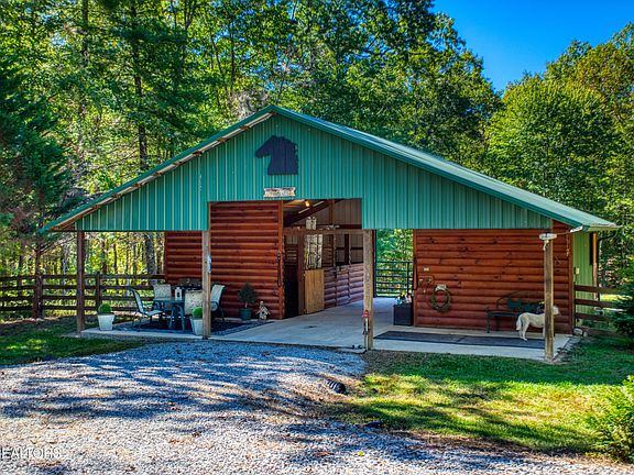 CENTRALY LOCATED on the trail system in the EQUESTRIAN COMMUNITY of SPRUCE CREEK ACRES. TRUE LOG HOME construction. Home comes MOSTLY FURNISHED. Cathedral ceiling, gas fireplace, custom wood railing leading UP to the LOFT area that also contains a 1/2 bathroom. Custom designed LARGE upper windows. Covered front porch as well as Covered back decking overlooking the BARN & pasture area. Bedroom is on the main level. Heating & cooling is run by a MINI Split pack as well as baseboard heating in the main level full bathroom & bedroom. Pasture is fully fenced. 32x36 barn that matches the log style home with metal roofing, (2) 12x12 stalls, separate hay storage, tack area & a FULL BATHROOM WITH washer & dryer. Plenty of room to store your trailers. HIGH SPEED INTERNET in this community. 8-10 miles of community horse trails as well as a TRAIL that takes you directly into the BIG SOUTH FORK NATIONAL PARK with 220 miles of dedicated horse trails.
