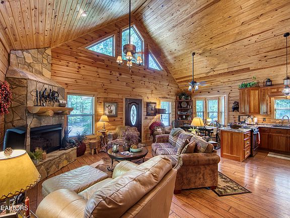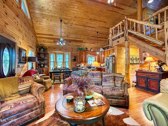 Gas fireplaceTrue log home constructionLoft areaCovered front porchBaseboard heatingTrail systemCathedral ceiling