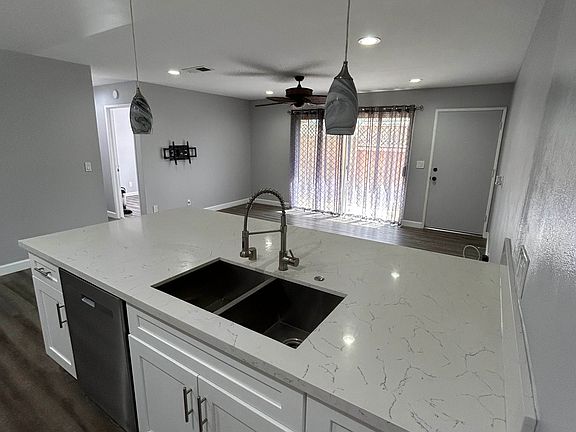 Breakfast barMatching counter backsplashOpen floor planRecently remodeled kitchenRecessed lightsDouble stainless steel sinkUpgraded cabinet
