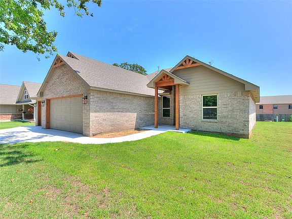 New Home in Brush Creek. A charming and spacious home located in the desirable community of Harrah. This stunning property offers a perfect blend of comfort, style, and modern living, making it an ideal place for you to call home. As you step inside, you are greeted by a bright and open floor plan, designed to maximize space and natural light. The main living area is spacious and inviting, with large windows that flood the room with sunlight. The heart of the home is the well-appointed kitchen. It features sleek granite countertops, ample cabinet space for storage, a center island with a breakfast bar and modern stainless-steel appliances. The kitchen seamlessly flows into the dining area, making it convenient for entertaining guests and hosting family gatherings. The master suite is a private oasis, complete with a walk-in closet and luxurious en-suite bathroom. There's 3 bedrooms plus a study/4th bedroom, 2 baths and 3 car garage. Easy access to the Turnpike. Minutes to Tinker AFB.