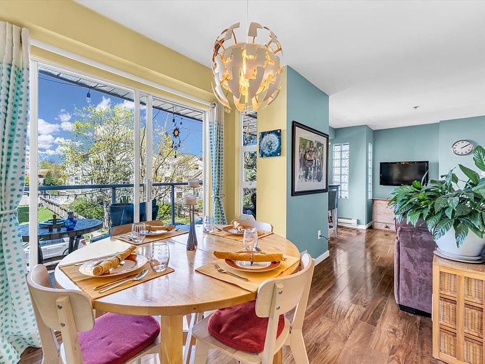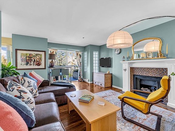 This bright and spacious 2 bed/2 bath unit offers a rare combination of comfort, functionality, and charm. Tucked away on the quiet northwest corner, this home features a generous living area with beautiful vinyl floors, a cozy gas fireplace, and a dedicated dining room that opens onto a covered balcony, perfect for year-round enjoyment. Large windows fill the space with natural light and offer a lovely treed outlook for added privacy and tranquility. The walk-through kitchen is both practical and inviting, while the well-sized bedrooms include a primary suite with its own private balcony! Located in a well-maintained, rainscreened building, you're just a short walk to VGH, Canada Line, City Square & Douglas Park. 1 parking stall & a locker.