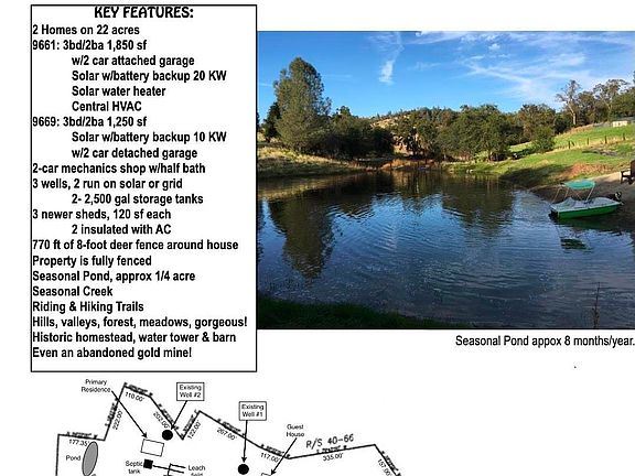 2 homes on 22 beautiful rolling, tree-studded acres. Each home has its own street address and are separately metered. They are roughly 1/8-mile apart. 9661 is 3-bedrooms/2-baths with 1,850 sf, central HVAC, a 2-car attached garage, a 20KW solar system w/battery backup(paid for) and solar water heating (supplementing propane water heater). 9669 is 3-bedroom/2 baths with 1,250 sf, a 2-car detached garage, and a 10KW solar system with battery backup (also paid for). There is a modern, well-lighted 2-car mechanic’s shop with its own half bath. There are 3 wells; 2 run on solar, with two 2,500-gal storage tanks. 1 well is dedicated to supporting the seasonal pond during dry months. 8ft deer fence surrounds 9661, a raised organic garden, 3 green lawns, and 3 modern sheds styled like a village with an outdoor bar for parties. Property is fully fenced. Seasonal pond, hills, valleys, forest, meadows. Gorgeous! Historic buildings & water tower, a chicken coop, even an abandoned gold mine! Both houses updated & remodeled and look great. Move-in condition. All the heavy lifting is done. The property itself is magical, with lush and mysterious hiking & riding trails winding through this nearly 1/2 mile long, very private parcel. Total privacy yet close to town. Sonora is just 8 minutes away.!