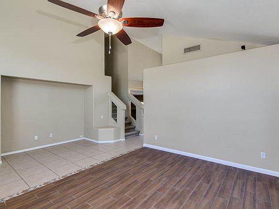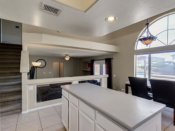 Amazing find in the New River Ranch community of Peoria! Tri-level home on corner lot w/ expanded concrete slab driveway - perfectly situated for an RV gate or additional parking. Enter into the spacious formal living room w/ wood-look tile floors, decor pottery shelves & vaulted ceilings. Updated kitchen w/ white cabinets, stainless steel appliances, large island & tons of counter & cabinet space. The kitchen, living & dining rooms all have views of the beautiful backyard & are setup as an open concept design; ideal for entertaining. Three good-sized bedroom upstairs, tile hallway floors, updated bathroom vanities, walk-in closet & tiled shower at the master bathroom. The quiet backyard oasis is perfect for any occasion w/ large play-pool + baja step, extended covered patio, built-in BBQ
