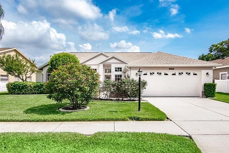 TIMBER GREENS AMAZING VIEWS AND IMMACULATE HOME...This 4 bedroom, or 3 bedroom w/study, 2 bath, oversized 2 car garage home is all ready for you. From the moment you walk in the new front door with etched glass you will fall in love... The Great room is spacious and open to the golf course with fantastic views of a pond, trees, holes 7, 8, and 9. You will love the tranquility from most rooms especially the spacious lanai...split bedroom plan, inside laundry. The kitchen which features wood cabinets, corian counters, updated appliances, updated tile flooring, and a breakfast nook with gorgeous windows overlooking amazing views. And washer and dryer 3-4 years old, updated ROOF, water softener, water heater and so much more...and located in a fantastic 55+ gated community. Large Cub House with Restaurant, Card rooms, Exercise room, Olympic-sized pool, 18- hole Golf Course, Tennis courts and entertainment. must to see call today