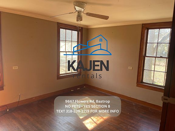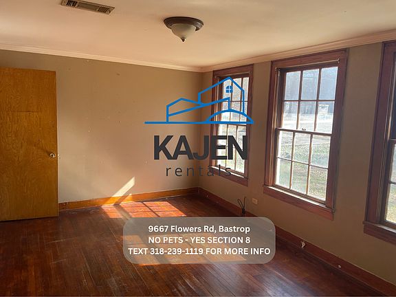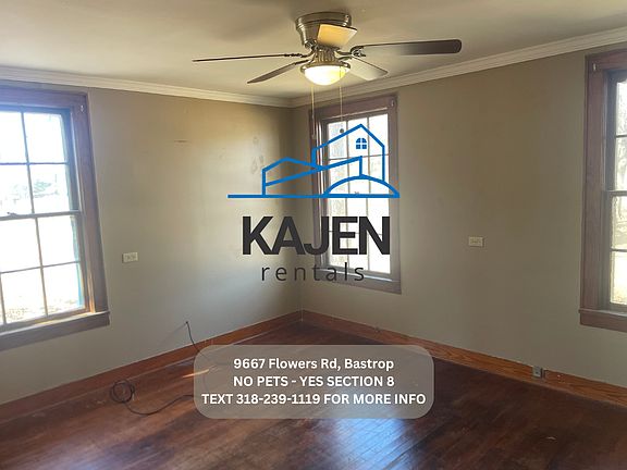 Please read the following information prior to contacting us as this should answer most questions. -Yes Section 8 -No Pets -No rent to own -No smoking inside -Rent is $635.00 -Deposit is $500.00 -Income will be verified on each tenant. -(headed to Mer Rouge on the right, past Walmart) -Central Heat and AC. -Located at 9667 Flowers Rd, Bastrop. -You provide refrigerator. -Includes stove. -Includes dishwasher. -3 bedroom 1 bath home. -You pay utilities (water, electric, trash) -We provide Lawncare 50 background and eviction check per adult ) --Add on options to Resident Benefit Package can include: On Demand Pest Control: $10/month.