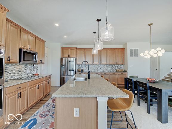 Everyone hangs out in the neighborhood cul-de-sac. This is the Fishers home with a finished basement on a cut-de-sac you've been waiting for! 5 bedrooms, 3.5 baths plus an office! 9' ceilings on the main level, you're welcomed by a wide entry with an office at the front. Step in further and you're treated to a super open floor plan - family room, kitchen, dining area and morning/sun room all flow together. It's great for entertaining and just spreading out but within earshot and eyesight of everyone in the family. The family room features a gas fireplace, the kitchen has tons of maple cabinets, quartz counters, double built-in ovens and that big center island everyone loves to gather around. The morning/sun room adds depth to the plan and feels so big with its cathedral ceiling! Everyone's got their own locker and boot bench at the garage entry. The primary bedroom is large, its bath with dual quartz vanity, updated mirrors, tile backsplash a big tile shower and a sizable walk-in closet. Each additional bedroom is generously sized. The loft is a great space for homework and gaming. Hooray, the large laundry room is also upstairs, complete with a sink and cabinets with a butcher block counter. There's tons more living space in the finished basement with the 5th bedroom and full bathroom, custom built-ins with electric fireplace, a play/exercise room and a generously sized storage area! Let's take the party outside to the covered porch and paver patio with a dedicated grill space, and huge back yard! The included high quality Blue Raven solar panels on the roof significantly reduce the electric bill for this home! This elevation has a full brick wrap on the main level and full dedicated garage bay for storage of bikes and all of life's toys! It shows great and it's move-in ready!