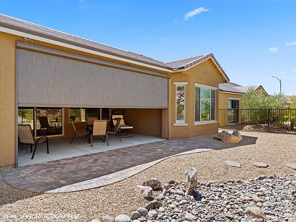 MOVE IN READY HOME PRICED TO SELL SUN CITY. Better than new-no construction delays! This upgraded Pursuit model in Sun City Mesquite's golf community sits on a .21-acre fully fenced lot with low-maintenance landscaping and an extended paver patio, perfect for desert living and pool potential. The covered patio features a full-length automatic solar shade. Inside, plank tile flooring covers the main living areas, while the bedrooms have new carpet. The bright, open-concept layout includes a great room with an upgraded Audio-Visual wall and fireplace. The kitchen offers an oversized quartz island, large basin sink, upgraded range hood, custom glass tile backsplash, and premium cabinetry. The main suite includes a bay window and spa-like ensuite with zero-threshold tile walk-in shower with river rock flooring, dual under-mount sinks, and a large walk-in closet. A convenient half bath and den/office/music room with double doors add versatility. Laundry room features a sink, additional cabinets, and washer/dryer included. Guest bedroom and full bath are on the opposite side for privacy. FULLY EXTENDED & finished garage offers extra room for vehicles and storage. VIDEO: https://youtu.be/Ct6gMwu-SJ0