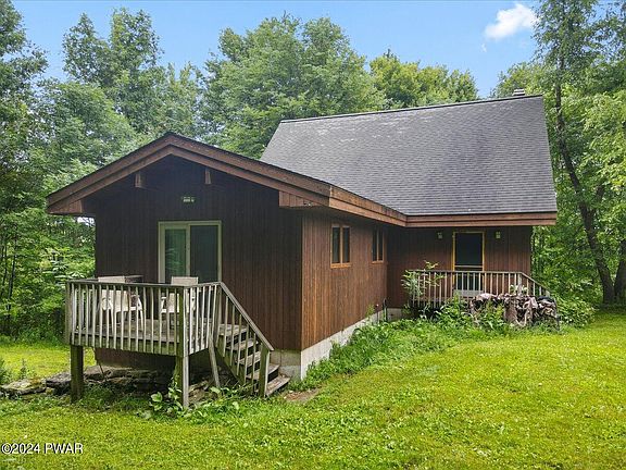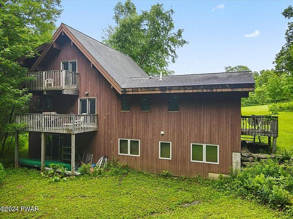 Escape to your mountain sanctuary at this exquisite rare ''Lindal'' Cedar chalet home on 45 acres of pristine wilderness with your own private spring fed pond and access to a large lake for additional recreational activities! Located in Thompson, PA close to Elk Mountain, enjoy the tranquility of your surroundings as you arrive at this stunning retreat, where a spring-fed pond sparkles invitingly and private lake privileges promise endless adventures. Step inside to discover the impressive design and workmanship of a Lindal Cedar Home! Appreciate the haven of comfort and luxury, where the rugged beauty of the outdoors seamlessly blends with elegant interiors. The main level has living and dining areas as well as two bathrooms and primary bedroom for ultimate convenience. Prepare to be captivated by the grandeur of the living room, illuminated by the brilliance of exceptional vertical windows that flood the space with natural light, offering breathtaking views of your retreat. Gather around the floor-to-ceiling stone fireplace on chilly evenings, savoring the warmth and ambiance it provides. Indulge in the serenity of outdoor living with multi-tiered balconies and decks that beckon you to unwind amidst the splendor of nature. Cedar wood ceilings lend a crisp and clean feel to the interior, complementing the rustic charm of the surroundings. Upstairs, a spacious loft area offers a peaceful retreat, while the finished lower level invites endless hours of entertainment and recreation, perfect for all manner of fun and games. With easy access to Elk Mountain, outdoor enthusiasts will delight in the myriad of recreational opportunities that await just beyond your doorstep. Whether you seek adventure on the slopes or tranquil moments by the lake, this mountain cabin chalet offers an unparalleled retreat for those who appreciate the finer things in life.