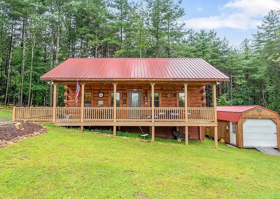 Welcome to your hand-hewn log cabin retreat, built in 2018 and nestled in the serene Blue Ridge Mountain foothills of Fancy Gap. This charming home offers 756 sq. ft. of thoughtfully designed one-level living with 2 bedrooms, 2 full baths, an open living room and kitchen, laundry area, and beautiful hardwood flooring throughout. The authentic hand-hewn log construction and durable metal roof provide timeless style and low-maintenance living, while the efficient heat pump ensures year-round comfort. Outdoor living is a dream here with a spacious 340 sq. ft. covered front porch, perfect for sipping your morning coffee while watching deer and wildlife, plus an additional 636 sq. ft. of open decks along the side and back for entertaining or relaxing in the fresh mountain air. A 12 24 detached building/garage offers extra storage or workshop space, and a newly added drainage ditch with decorative gravel and a small bridge blends practicality with charm. All furniture and most household items convey, making this property move-in ready. Situated on a peaceful lot just 5 miles from I-77, Hwy 52, and the Blue Ridge Parkway, you'll enjoy both easy access and a private setting—ideal for full-time living or a weekend mountain getaway. With its rustic beauty, modern conveniences, and prime location, this home is the perfect blend of comfort and nature, offering the peaceful mountain lifestyle you've been dreaming of.