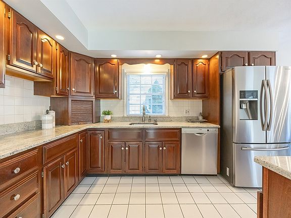 Nestled on a spacious corner lot, this charming 3-bedroom Colonial offers an exceptional blend of classic design + modern amenities. The fully fenced yard is a private retreat featuring a deck, patio, shed, + sport court—perfect for outdoor entertaining & recreation. Inside, the first floor boasts a well-appointed kitchen w/ gas cooking, granite countertops, & an inviting eat-in area. The fireplace living rm flows seamlessly into dining area, while a large vaulted-ceiling family room w/ sliders opens directly to the deck & yard, creating a bright & airy gathering space. A convenient half bath w/ laundry completes the main level. Upstairs, you'll find 3 generously sized bedrooms & a full bath w/ double sinks & shower/tub combo. Spacious primary suite includes an ensuite bathroom & a sunlit walk-in closet with windows. Finished lower level offers versatile space ideal for playroom/home office/media room, w/ walkout access to patio and yard, an addl half bath & a 1 car garage!