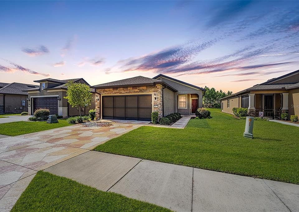 This stunning home is located in the gated, Stone Creek golf course community, a 55+ community packed with gracious amenities. Premium setting overlooking green space and stacked curb appeal, paver-lined and decorative driveways and walkways that match the home’s beautiful and fresh exterior colors add attractive curb appeal to passersby. The home offers $40,000 in upgrades including a whole home surge protector, peaceful nature buffer views, open living space, neutral colors, and an abundance of natural light. A large gathering room with low maintenance tile floors opens onto the beautifully equipped kitchen featuring granite countertops, tiled backsplash, a pantry for additional storage needs, and a large center island with pendant lighting and bar height seating for casual dining space. Added options include the whole house catalytic carbon filter providing fresh and cleaner water along with the Nuvo conditioner and also a UV light for the A/C which improves the quality of your indoor air and rids the A/C from getting any mold and bacteria. Master suite offers a spacious walk-in closet, an en suite bath with a walk-in shower, a double sink vanity, and a decorative concrete extended lanai with a roof slider that opens to a screened Florida room overlooking quiet green space. Inside laundry, two-car garage, and large screened lanai/birdcage area with pavers for outdoor entertaining and relaxing are just a few more things you will love about this home. All the bells and whistles can be found in this spacious home with a bonus den/office and an extended garage for extra space for a golf cart or hobby area. Move in, Relax and Enjoy hassle-free lawn maintenance, it is taken care of for you so you have more time to enjoy fantastic community activities and amenities including a golf course, resort-style pools, health spa, trips and entertainment, and more!