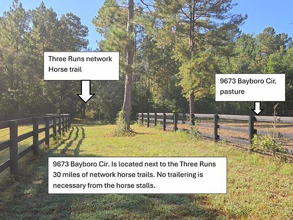 The property includes 2 barns with a total of 5 stalls, with tack room, full bath, and break room all temperature controlled. The entire property is fenced and cross-fenced, and ready for your horses. Three Runs Plantation is a premier equestrian community. The facility includes 2 mirrored dressage and 2 jumping arenas and 30 miles of riding trails surrounding the neighborhood, all directly accessible from the property. Additional space has been created for a garage or workshop designed to accommodate a lift for car enthusiasts. HOA includes access to the beautiful club house, pool, activity center, and gym. This property is a must see for those looking for an equestrian ready property with an abundance of riding trails.