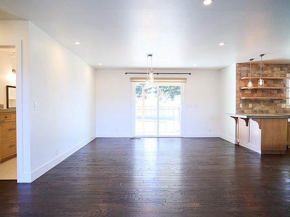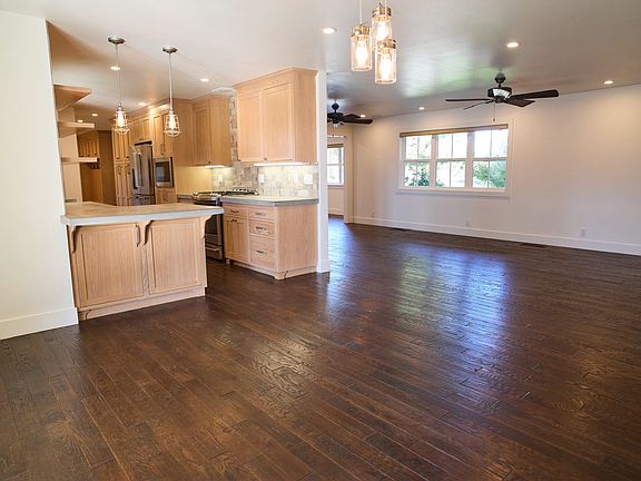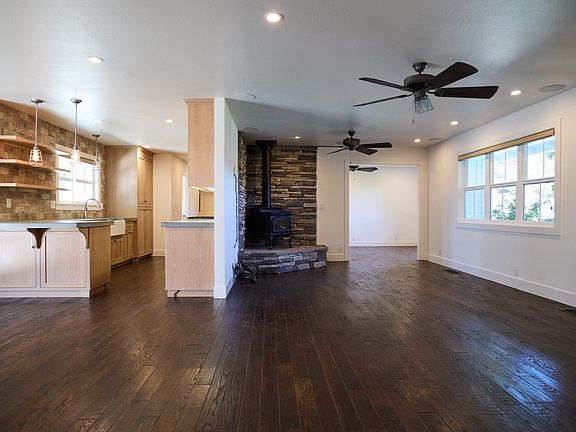 Inside, the home's heart is its thoughtfully designed galley kitchen. Sleek concrete countertops pair with floating shelves, custom cabinetry, and pendant lighting to create both beauty and functionality. Built-in drawers and abundant pantry space ensure everything has its place. The warmth of wood flooring flows through every room, softened by natural wood tones and finishes that bring a sense of character and welcome.