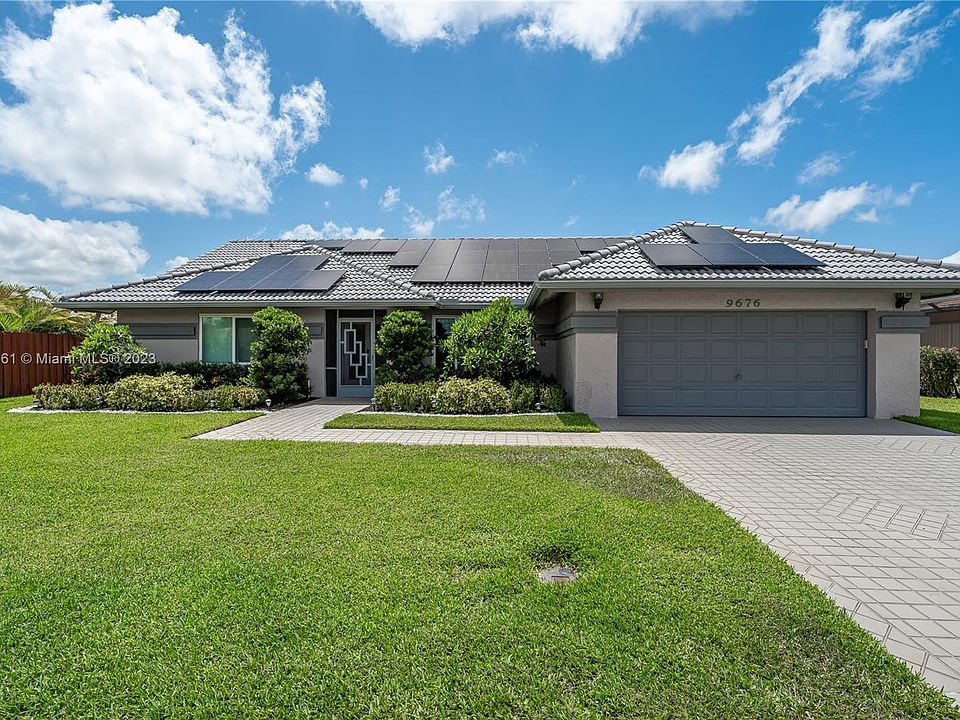 This spectacular home has it all...pool, lake, open floor plan! Featuring 3 bedrooms with a den/office (can be a 4th bedroom) vaulted ceilings and so much more. New impact windows and doors throughout, oversized screened patio and pool, facing west for a perfect view of the sunsets! Pool was recently resurfaced with new pool heater! Updated kitchen with all newer appliances, and updated bathrooms too! And last but not least, this home boasts a new 17.995 KW solar system, producing 100% of the electricity needed to power the house, saving you $$$ on the electric bill! Terrific community with new tennis & pickleball courts. HOA includes high speed internet & cable! Fantastic West Boynton location just east of the turnpike and Jog Road. Great schools too! This home will not last!!