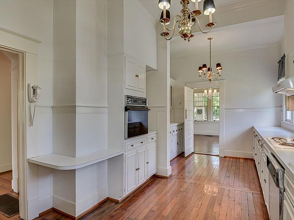 The large windows bathe the interior in natural light, highlighting the intricate woodwork and craftsmanship throughout. The formal dining room, with its elegant moldings, pillars, and rich history, is perfect for hosting family gatherings and holiday dinners. The kitchen, a blend of vintage charm and modern convenience, offers ample cabinet space and room for culinary creativity. Just off the kitchen, a bright sunroom, converted from a back porch by Clifton Construction, doubles as a laundry room and provides the ideal spot for morning coffee while overlooking the expansive backyard. The kitchen and sunroom have beautiful heart of pine flooring reclaimed from a mill in downtown Augusta!