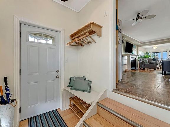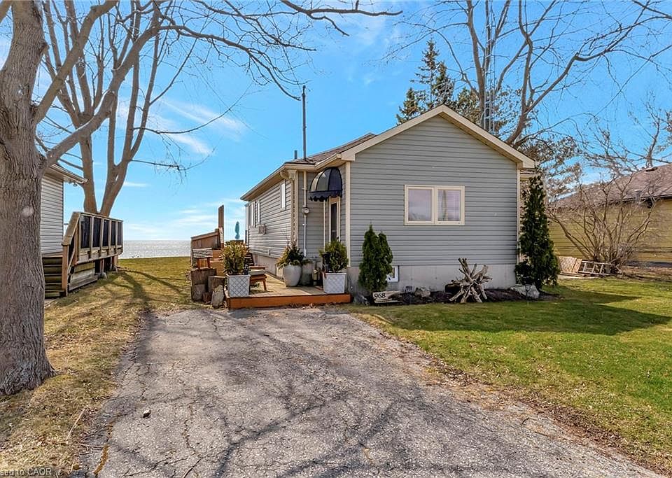 Discover the perfect blend of modern comfort and lakeside charm in this meticulously renovated all-seasons waterfront home. Wall-to-wall south-facing windows flood the open-concept living space with natural light, showcasing a maple kitchen with crown molding and tray ceilings. Enjoy seamless indoor-outdoor living with double garden doors leading to an enclosed sunroom and entertainment deck, perfect for extended gatherings with family and friends. Two cozy bedrooms and a stylish 4-piece bath offer comfortable accommodations year round. Practical upgrades include modern vinyl siding, updated roof shingles, quality windows and exterior doors, a high-efficiency natural gas furnace, central air conditioning unit, gas fireplace, 100 amp hydro and new panel. A 651 sq ft poured concrete fully finished basement provides additional living space suitable for a third bedroom, family room and future bathroom addition if desired. Step outside onto your tiered observation deck, and descend to your private sand and pebble beach via a professionally rebuilt "Wilkinson" break-wall. A paved drive, garden shed, and privacy fence complete this exceptional waterfront package. There is also a custom storage unit that safely stores up to three kayaks. This is your chance to own a piece of Lake Erie paradise. The specific location of this property is tucked away in a sandy bottom cove that is westerly wind protected by Peacock Point providing optimal enjoyment throughout the year. If so desired as an investment property, there is ample amount of income potential as a vacation rental.