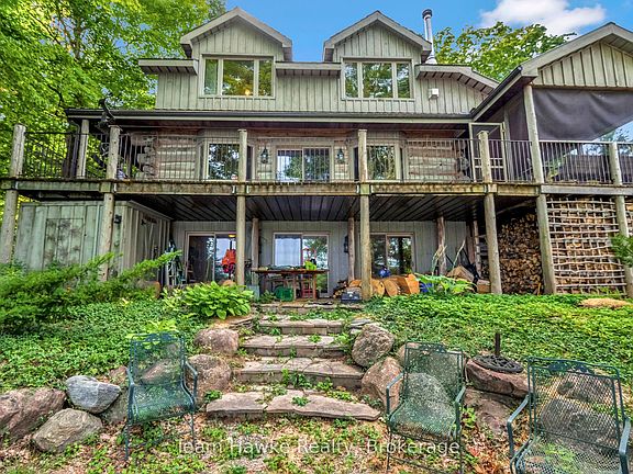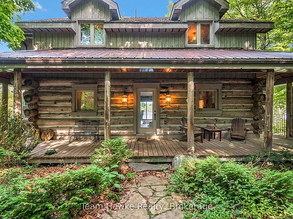 One of only eleven waterfront properties on Sumac Lane, this stunning four-season log home, built in 2005, offers just under 74 feet of frontage on Little Lake. Tucked away on a privately maintained road, the home screams rustic charm, creating an ideal year-round residence or weekend retreat. Inside, the heart of the home is the large chefs kitchen, complete with a generous island and open to the main floor living and dining areas, perfect for entertaining family and friends. Beautiful cherry floors and cupboards complement the natural log construction, while three copper-surround fireplaces (one on each level, including in the primary bedroom) add warmth and character throughout. The spacious primary suite spans the full length of the home along the water side, offering breathtaking views. The walk-out basement features a large recreation room, sauna, and easy access to the outdoors. Enjoy the wrap-around porch, expansive back deck overlooking the water, and a fully screened-in sunroom off the main living room. Only 90 minutes from the GTA, this property offers a rare combination of privacy, comfort, and peaceful waterfront living that could either be your home away from home, or your full time residence.
