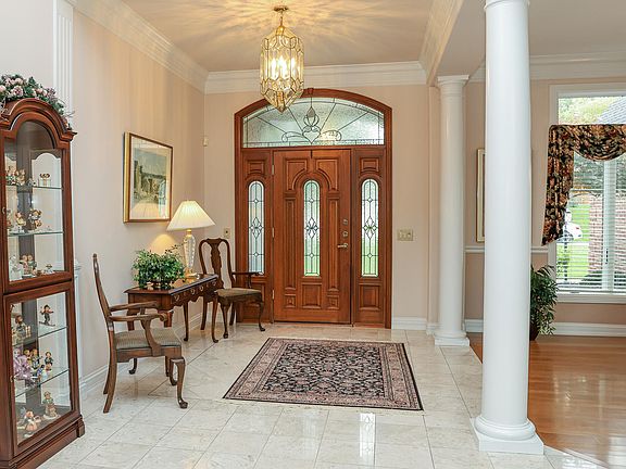 Upon arrival, a stately covered entry welcomes you with an etched glass wood door, double sidelights, and chandelier brightening the foyer. To the left, a formal dining room features a second chandelier, rich hardwood flooring, decorative columns, double crown and chair rail molding.