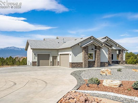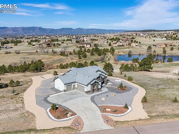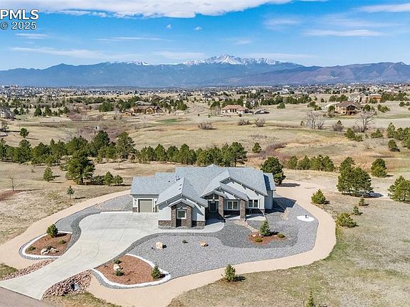 Located at the highest point in Highland Park, this stunning custom home offers panoramic, unobstructed views of Pikes Peak from every room. Backing to a serene pond and protected nature preserve, the light-filled, open-concept layout brings Colorado’s breathtaking beauty straight into your living space. From this elevated vantage point, take in sweeping vistas of snow-capped peaks stretching from Pikes Peak to Cheyenne Mountain, the Sangre de Cristo range, and the Rampart Range. The setting feels expansive, with 2.5 acres of land enhanced by open space, a pond, and greenbelt—giving the feel of five private acres. The great room features walls of windows that frame Front Range views, with Pikes Peak as the central focal point. Elegant board and batten ceilings add warmth and dimension. The kitchen is complete with black stainless appliances, custom cabinetry, stylish hardware, Corian countertops, and designer lighting. The dining and hearth room boasts a contemporary gas fireplace with a beetle-kill pine mantle, creating a cozy yet modern ambiance. Step out onto the covered deck spanning the rear of the home to enjoy spectacular sunrises and vibrant sunsets. The spacious primary suite captures mountain views and includes a luxurious en-suite bathroom and a walk-through closet that leads to the laundry room. The expansive lower level—with more incredible views—offers versatile space for a game room, home theater, craft area, or playroom. Thoughtful upgrades include custom Scottish stained glass window accents, a graceful curved staircase, UV-tinted windows, and a main-level office that can easily serve as a fourth bedroom. Additional highlights: board and batten ceilings, mesquite-style manufactured hardwood floors throughout, and low-maintenance xeriscaping with drip lines. This rare retreat offers the peace of country living just minutes from a major hospital, premier shopping, and District 20 schools.
