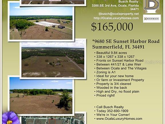 This is a beautiful 9.84 acres that fronts on Sunset Harbor Road between US 441/27 south and Lake Weir. So close to The Villages. Zoning is A1 for a home or farm, or investment at this good price. Property is about 1/2 cleared and wooded in the back. No Flood Plain here. Sign will be up soon. Property is between the two addresses above and has 338.2 front feet on the Sunset Harbor Paved Road. Drive by today. Fenced property and offered ''as is'' No zoning contingencies. Really nice location and land.