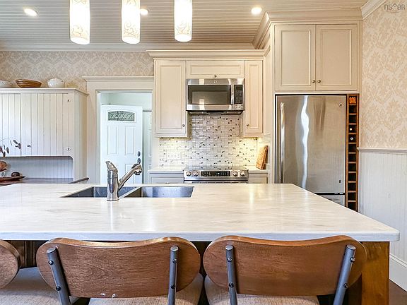 Nestled in the vibrant village of Canning, this beautifully maintained 2-storey home offers the perfect blend of character, comfort, and modern updates—all within walking distance of local shops, cafes, and both the elementary and high schools. Step inside to discover a thoughtfully designed main floor layout featuring a welcoming front foyer, a cozy living room, and a spacious family room anchored by a wood stove—perfect for chilly evenings. The elegant, renovated kitchen (2018) is a true standout, complete with a custom island, Corian countertops, and a layout that’s ideal for family meals and entertaining. A formal dining room opens to the back patio and garden area, offering seamless indoor-outdoor living. You'll also find a convenient back entrance with laundry and a half bath, tucked away for practicality and ease. Upstairs, you'll find four bedrooms and a full 4-piece bathroom, ideal for growing families or those needing extra space for guests or a home office. Original features such as the curved staircase and historic "marble" wall finish add unique character and timeless appeal throughout the home. Additional features include metal roof (2018), updated windows (approx. 10 years ago) and Single detached garage. This home is a rare find in a welcoming community, offering a lifestyle of comfort, charm, and convenience. Whether you're relaxing by the fire or enjoying the local shops, cafés and restaurants, this property truly offers the best of the Annapolis Valley. Just a 10-minute drive to Wolfville and quick access to the highway, this location strikes the ideal balance between small-town living and urban convenience.