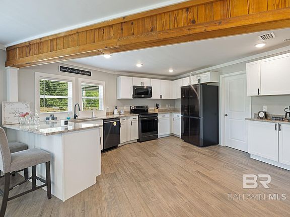 Welcome to this truly unique lighthouse-inspired home, perfectly situated on 1.09 acres in peaceful Elberta, Alabama. Bursting with charm and character, this property is ideal as a full-time residence, second home, or vacation rental. Inside, you'll find a spacious, open layout with wood and wood-look flooring throughout. The fully renovated kitchen and bathrooms blend modern convenience with timeless style. The kitchen features updated cabinetry, countertops, and appliances, while both bathrooms have been beautifully refreshed. Upstairs, the cozy "crow's nest" offers a flexible space perfect for a home office, second den, reading nook, or creative studio — all with views that capture the unique character of this home.The large lot provides privacy and plenty of room to relax or entertain, with endless potential for outdoor living. With its rare lighthouse design, updated interior, and versatile floor plan, this home is a standout opportunity in a quiet yet convenient location.Let this charming coastal-inspired retreat be your next home or investment! Buyer to verify all information during due diligence.