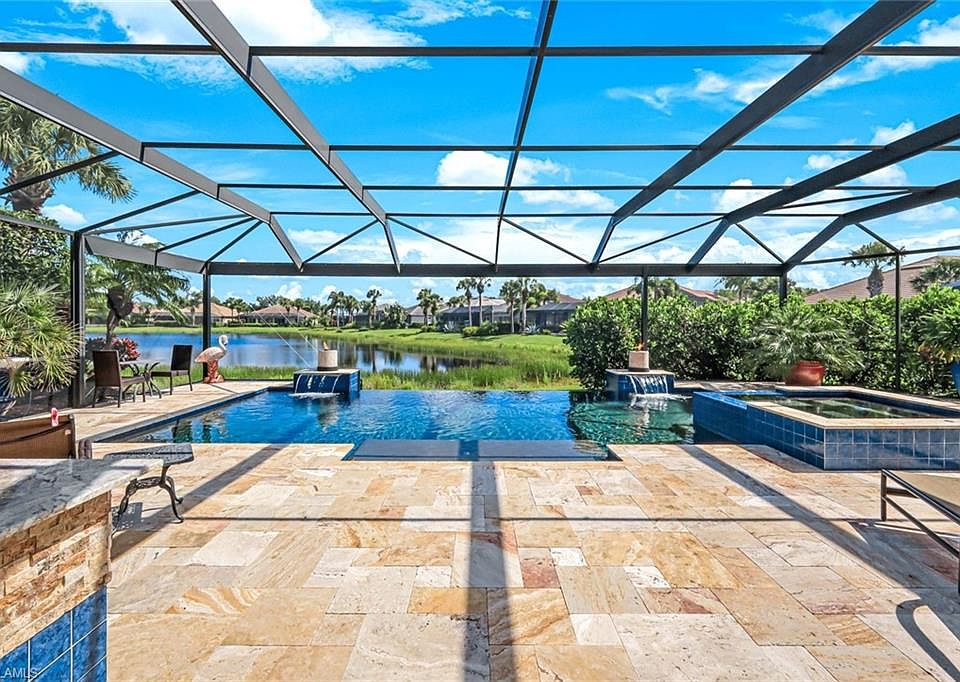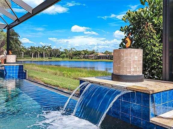 LIVE A VACATION LIFESTYLE IN A COUNTRY CLUB SETTING! This customized, spacious home features 3 BEDROOMS PLUS A DEN, 3 FULL BATHS, A RARE 4 CAR AIR CONDITIONED GARAGE and is situated on an oversized pie-shaped lot. This exceptional home is perfect for entertaining friends and family. Step outside to your private resort-style lanai, where a saltwater infinity pool and spa await - enhanced with breathtaking fire and water features, a picture window screen for unobstructed water views, and elegant marble travertine tile. The custom outdoor kitchen is fully equipped with an oversized stove, grill, sink, dishwasher, refrigerator, blender and plenty of built in storage, while the outdoor shower, nebula lighting, and lush landscaping add the perfect finishing touches to your outdoor oasis. Inside, enjoy a bright layout with porcelain tile and hardwood flooring throughout (no carpet), quartz countertops, a farm-style sink and custom tray ceilings. A long list of special features and upgrades include an air conditioned 4 car garage ideal for car collectors, boats, or a home gym, newer tile roof (2019), newer water heater (2024), newer HVAC (2021), custom outdoor landscaping and lighting throughout, freshly painted inside and out, electric storm and accordian shutters throughout, 500 gallon propane tank for heating the pool and spa plus more! This home is a "must see" to appreciate the finishing touches. The Quarry—an exceptional lakefront community sprawled across over 500 acres of pristine lakes. This gated, amenity-rich environment is perfect for boating, water skiing, jet skiing, kayaking, and fishing enthusiasts. Enjoy the Beach Club, which features a resort pool, lap pool, hot tub, tennis, pickleball, and bocce courts, a Tiki bar with poolside food and beverage service, a state-of-the-art wellness center, and a full-time activities director who organizes a variety of social events. There is also NO WAITLIST for OPTIONAL golf membership to The Quarry Golf Lodge and a NEW Limited-time 3-year payment plan available for the PGA-level Hurdzan-Frye 18-hole golf course. Whether you are an avid golfer or simply want the lifestyle without the obligation, discover The Quarry!