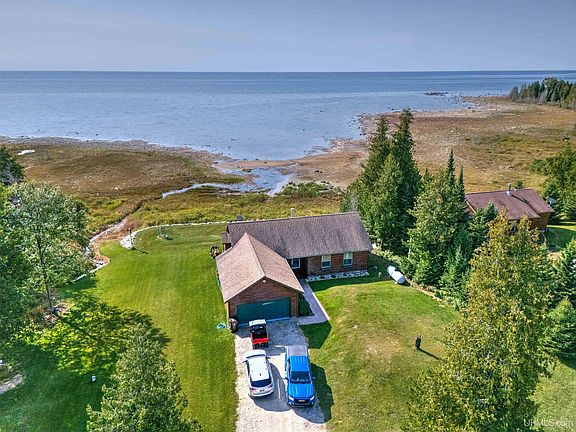 Lake Michigan Log Home Retreat – 154’ Private Frontage! | 3 Bed | 2 Bath | 1.7 Acres | Ranch Style | 2-Car Garage Escape to your dream Lake Michigan log home nestled on 154 feet of private lake frontage with 1.7 beautifully landscaped acres and a year-round flowing creek. This stunning ranch-style home offers 3 spacious bedrooms, 2 full bathrooms, and an attached 2-car garage, perfect for year-round living or a luxury getaway. Enjoy breathtaking lake views from the covered full-length porch, perfect for relaxing or entertaining. Inside, the home has been thoughtfully updated throughout with: New flooring New appliances Water softener & hot water heater Complete kitchen remodel Elegant marble flooring in both bathrooms Step outside and soak in the tranquility of immaculate landscaping, mature trees, and the gentle sounds of the creek at the property’s edge. Whether it’s morning coffee on the porch, kayaking from your private shore, or cozy nights in the log cabin warmth — this property is pure Up North Michigan magic. Prop# 008-725-003-00 Directions: 8.5 miles South of US Highway 2 on County Road 435. Turn left on Barque Point Trail. Follow road around the point to the home, approximately 1.5 miles.
