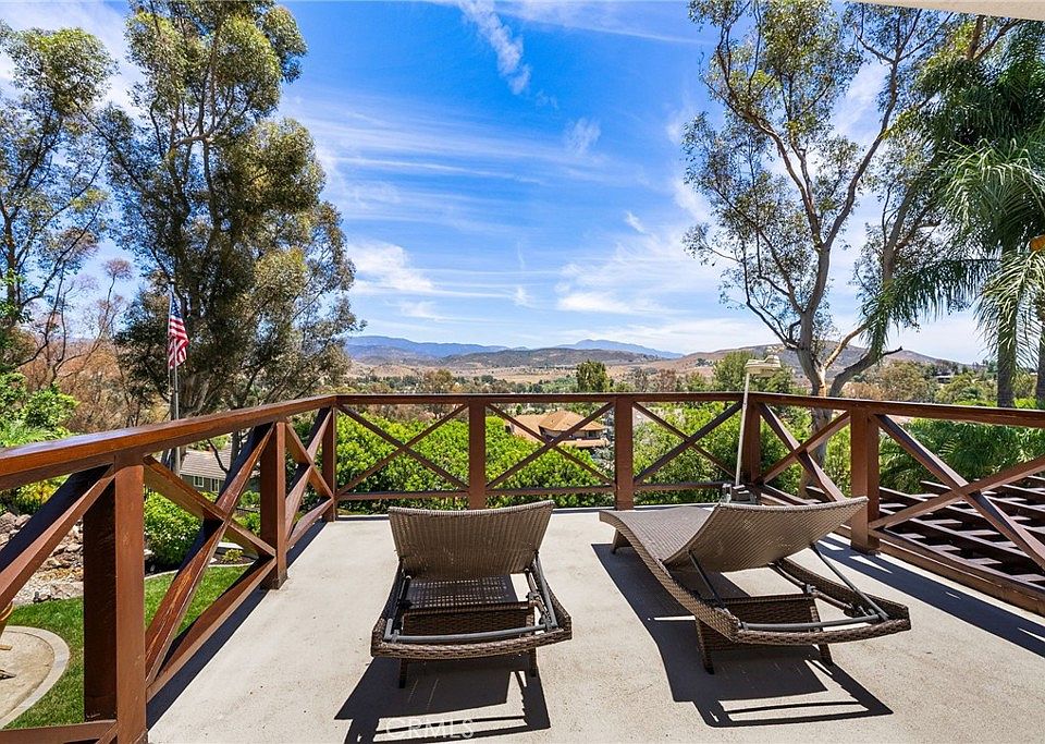 Sweeping canyon and hillside views set the tone at 9686 Ravenscroft Road in North Tustin—a beautifully upgraded 5-bedroom, 4-bathroom custom home located on a quiet cul-de-sac in the prestigious 24-hour guard-gated community of Rocking Horse Ridge. This over 3,200 sq ft residence offers a flexible layout with two bedrooms and two baths downstairs, and a luxurious upstairs retreat featuring a private balcony, generous walk-in closet, and even more panoramic views. The remodeled chef’s kitchen includes custom cabinetry, a granite island with bar seating, KitchenAid commercial appliances, dual wine coolers, and a warming drawer, flowing seamlessly into the inviting family room with a stone fireplace, leathered granite bar, and Sonos surround sound. From the main living areas, backyard, and upstairs retreat, you’ll enjoy incredible hillside scenery and natural light throughout the day. Elegant touches like cathedral ceilings, wainscoting, double barn doors, hardwood and slate flooring, and custom built-ins create a warm yet refined atmosphere. The backyard is an entertainer’s dream, complete with a covered dining patio, Twin Eagles grill, Green Egg BBQ, gas fire pit with wine barrel chairs, natural rock waterfall, outdoor Sonos sound, and soft landscape lighting. Additional upgrades include a tankless water heater, updated A/C ducting, new irrigation, custom gates, and a spacious 3-car garage with built-in storage. Enjoy access to community amenities like a pool, spa, tennis courts, sports courts, and clubhouse, along with top-rated Tustin schools and walkability to local shops, Pacific Ranch Market, and dining. This is California living at its finest—comfortable, scenic, and ready to enjoy. Welcome home!