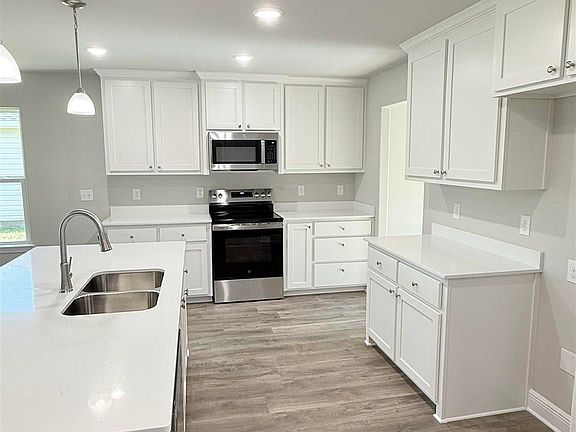 Spacious 1907 sq.ft. – Split Floor Plan, 4 Bedroom, 2 Baths, 2 Car Garage with Covered Back Porch. Open Floorplan with an Island Kitchen, quartz countertops, custom maple cabinets with soft close drawers, stainless-steel appliances and large pantry. Separate dining room with access to the kitchen. Trey ceilings in the master bedroom and living room as well as ceiling fans. All other rooms are braced and wired for ceiling fans. Quartz countertops in both bathrooms. Brushed Nickel Light Fixtures with matching finish on all faucets. ESTIMATED COMPLETION JULY