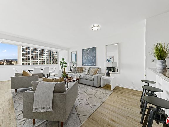 Large 1 bedroom, 1 bathroom condominium located in Park Westwood Towers, the premier luxury high-rise building in the heart of Westwood Village (only 1 block to UCLA). Features: open kitchen with stone counters, new stainless appliances, and breakfast bar; large open-concept living room/dining area with wonderful views of Westwood Village; primary bedroom suite with updated bathroom; new laminate wood floors; new paint; new HVAV system; new lighting; high ceilings; and incredible natural light from huge windows with City views. This sought-after NY-style building offers valet guest parking, 24-hour doorman, beautiful lobby and public rooms, onsite manager, stunning heated pool/spa, and low HOA dues ($641/month) which include: building amenities, water/sewer/trash, basic cable, internet, community laundry (near free), earthquake insurance and 1 gated parking space. Located close to restaurants, shopping, movies, 'W' Hotel and Trader Joe's.