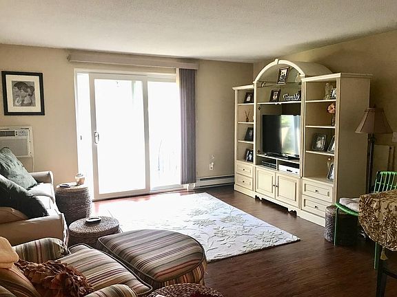 This fabulous 2 bedroom top floor unit comes with a fully applianced kitchen with separate dining area and living room with sliders to patio all with updated laminate wood flooring and built-in wall AC, master bedroom with double closets and second bedroom with built-in desk area and bath with updates! Building features include coin-op laundry in the lower level and additional storage! Deeded parking, extremely economical to heat and conveniently located!