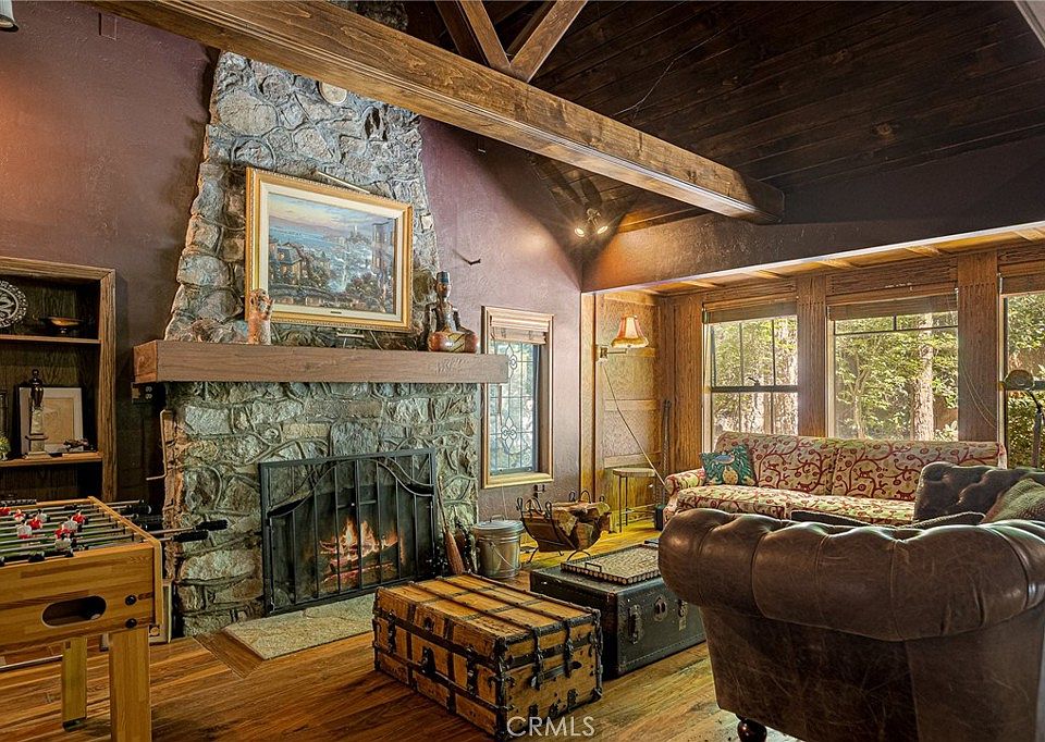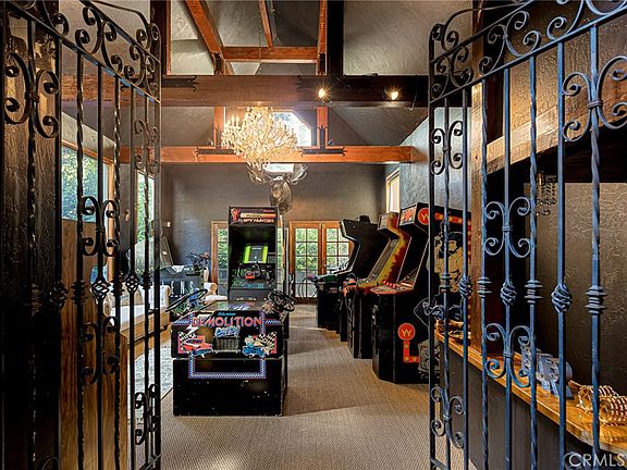 Featured on Zillow Gone Wild, this legendary cabin whispers stories of old Hollywood charm and elite escape. Long rumored to be the secret hideout of the Queen of Hollywood, Myrna Loy, The Greystone Manor continues to attract discerning travelers, artists, and tastemakers from around the world. Behind the gates, a winding drive leads to this rare gem, privately situated on an acre. The atmosphere is cinematic: dappled sunlight through towering pines, a stone fireplace flickering in the great room, and expansive windows framing views that shift with the seasons. Surrounded by vibrant oaks, whispering pines, mature bamboo, and bursts of seasonal color from Japanese maples, the setting is enchanting. With parking for over 10 vehicles and a 2-car garage, the manor welcomes guests with a sense of grandeur. Once inside, the main living room features a classic stone fireplace and vaulted open-beam ceiling, paired with rich hardwood floors. The country-style galley kitchen features imported slate flooring that flows seamlessly into the formal dining room, breakfast nook, and sunroom, creating a cohesive old-world warmth. Stained glass windows and French doors enhance the ambiance, while the chandelier-lit dining room opens directly to stone patios, perfect for al fresco meals beneath the stars. The primary suite is nothing short of magical—complete with a custom stone grotto waterfall shower. Just beyond, a whimsical “through the looking glass” hallway leads to an intimate theater room—ideal for screening vintage classics with friends and family. Upstairs, you’ll find four more guest bedrooms and a dramatic full bath worthy of a Hollywood siren. At the heart of the manor lies the show-stopping grand ballroom—now transformed into a spectacular arcade. With soaring ceilings, dramatic picture windows, full bar, and secret passages tucked throughout, this space is an entertainer’s dream. The Manor is truly one of one, an irreplaceable jewel blending romance, history, and storybook charm. A proven income-generating property that commands top-tier nightly rates from high-end clientele. With a steady stream of short-term rental guests, it has earned a reputation as a premier luxury retreat—equal parts private sanctuary and nostalgic escape. Whether you're a buyer with an eye for investment or a romantic drawn to the mystique of Hollywood’s golden age, the manor offers a once-in-a-lifetime opportunity to own a piece of timeless California history.