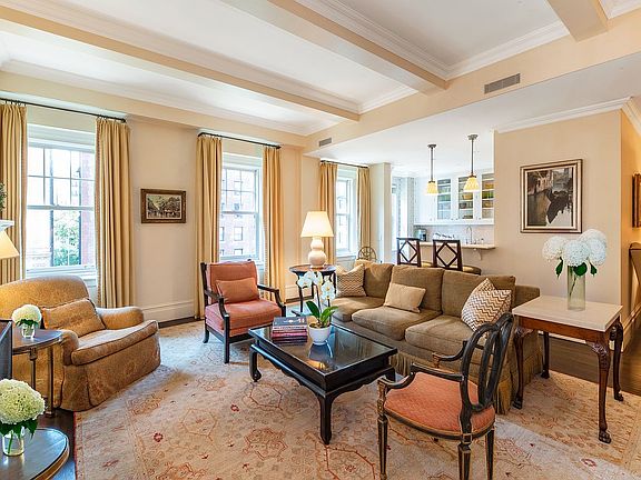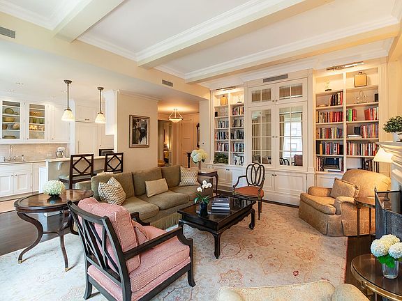 NEW TO MARKET! - Luxurious Park Avenue living awaits you in this 1400sf sprawling 5th floor two bedroom corner home in a premier white-glove cooperative. A gracious foyer welcomes you into the living room with its 10'6" beamed ceilings ,three extra large mullioned windows offering sweeping views up and down Park Avenue with a wood burning fireplace as focal point. The square living room makes for ideal furniture arrangement. Opposite the windows you find a wall of floor to ceiling custom cabinetry featuring ample shelving for books and/or the display of fine art or objects. A mirrored center section opens to reveal a large flat screen for home entertainment.