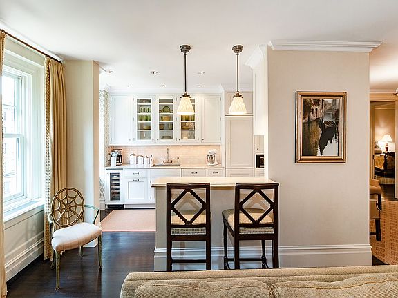 A semi-open kitchen features a marble breakfast bar that separates what is ostensibly a great room that functions as both living and dining. The opening to the kitchen gives a peek at what is to come in the form of an extra deep windowed galley kitchen appointed with the best of cabinetry, striking granite counters and an appliance array that includes a Sub-Zero refrigerator, two additional Sub-Zero drawers (one freezer and one refrigerator), a Sub-Zero wine storage, a Wolf gas range beneath an architectural arched hood and a Miele dishwasher. The bright white cabinetry is punctuated by polished nickel hardware and fixtures. All in all a very bright and inviting space with abundant natural light and western sunshine.