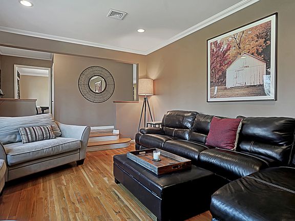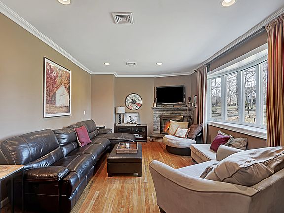 Move right in to this spacious three bedroom, two-and-a-half baths ranch in neutral tones with open concept space and oversized Trex deck overlooking a lovely tree rimmed yard in a sought after neighborhood! Enjoy get togethers in the elegant living room with illuminating bay window and corner stone fireplace. Beautifully updated eat-in kitchen with center island and new appliances including SubZero opens to a spacious dining room perfect for all your get togethers! Breakfast area offers sliders to the expansive deck. Master suite boasts walk-in closet and newer bath with glass enclosed shower stall. Two additional spacious bedrooms and full bath with dual sink vanity. Finished walk-out basement with large rec room and half bath for even more space to entertain! Two car garage and shed. Well maintained and freshly painted!