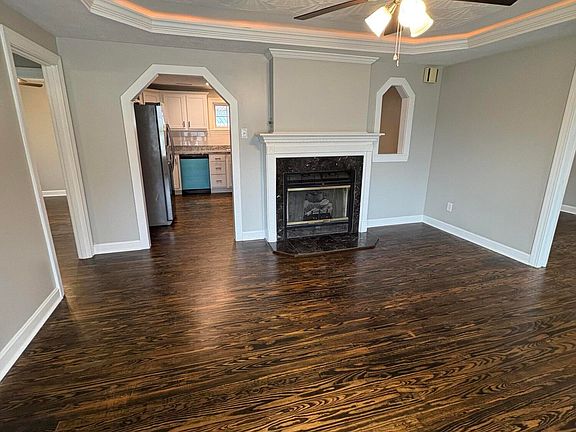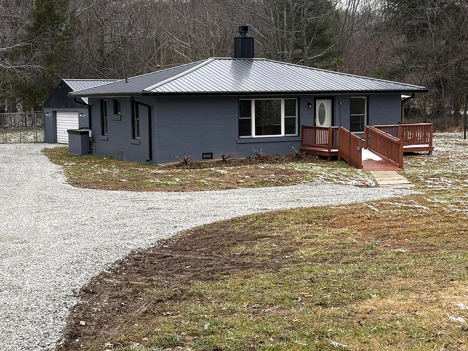 BEAUTIFUL UPDATED Home on .75 acre lot with completely fenced in back yard. The living room has a fireplace with gas logs. Original hardwood floors have been sanded and stained throughout. The kitchen has new white cabinets, counter top, back splash and stainless appliances. There are 3 bedrooms (2 without closet), and one full renovated bath. The exterior has been painted a modern color with new black gutters, downspouts, new metal roof, and new windows! Garage also has a new metal roof, cabinetry and electricity connected. Relax on the gigantic concrete covered back porch with railing that runs length of home. Gazebo also. There is a chain link fence with a partial wooden fence connecting chain link and garage. There appears to be a creek on side and back of property. Call today