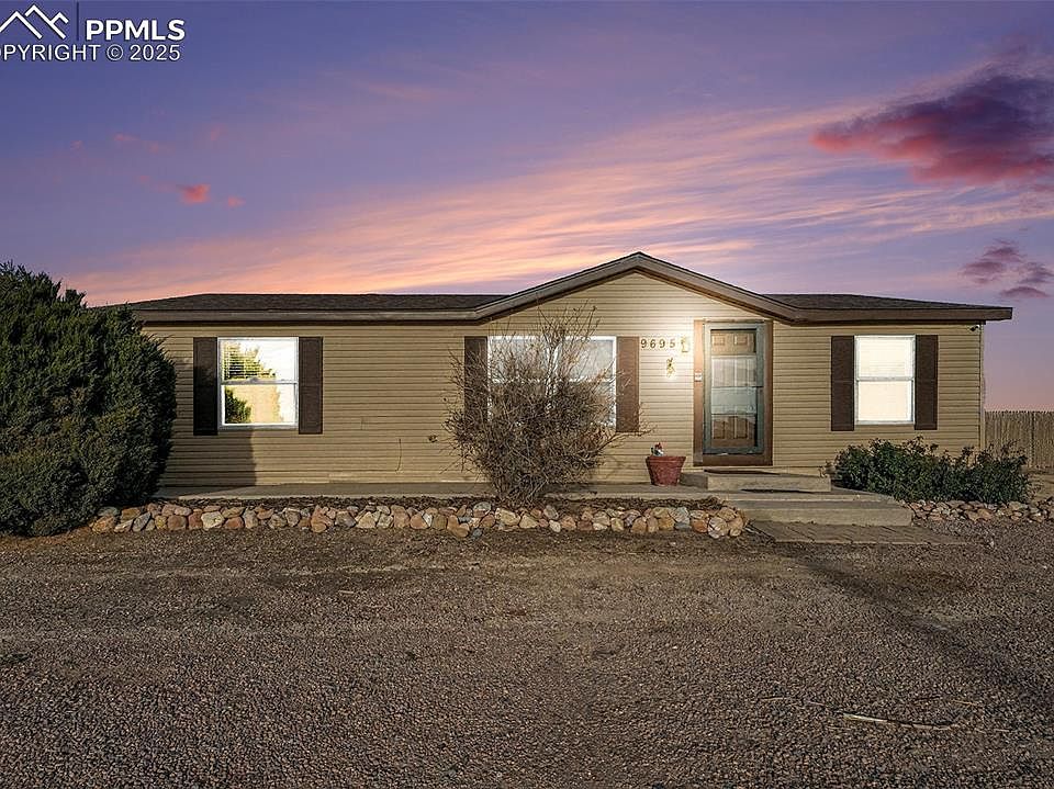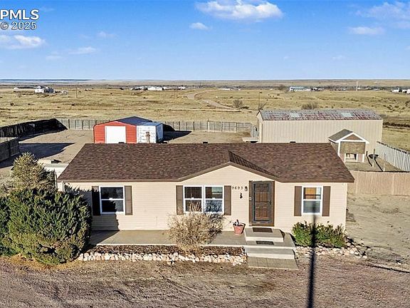 Bring all your animals and toys! Set on a generous 5 acre corner lot zoned for horses, this property offers the perfect blend of country living and modern convenience. The home has been thoughtfully updated throughout, featuring Bali wood blinds, newer wood style LVP flooring, new carpet, fresh interior paint, new trim, freshly painted cabinets, new hardware, and refurbished countertops! Stylish new lighting and plumbing fixtures, new ceiling fans in bedrooms, and updated shower doors in the master bath. The kitchen features stainless steel and black appliances, including a newer range/oven. Bright skylights in both bathrooms. New roof and new water heater! Cost efficient evaporative cooler to stay cool in the warmer months. Expansive fenced in back yard with privacy fencing and a huge separately fenced dog-run with built-in dog house. Massive garage/workshop, storage pod, and additional garage/storage outbuildings are all within the privacy fencing and perfect for all your toys and projects. Extended concrete patio in front. A quick drive to I-25 provides fast convenience to Colorado Springs, Fountain, and Pueblo. This is a must-see home!