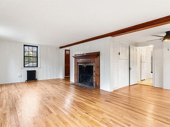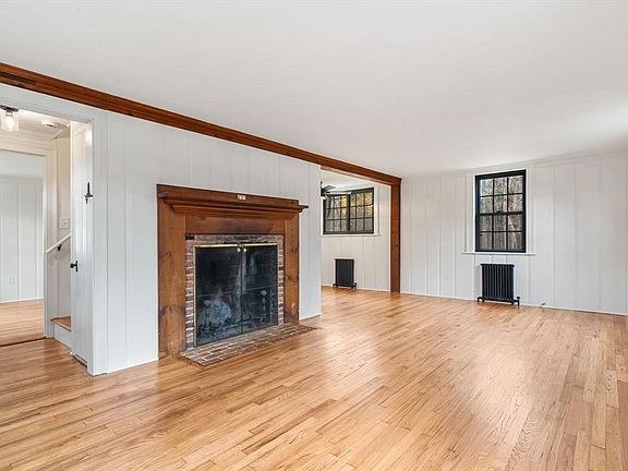 Charming center chimney rear dormer Cape! The front-to-back living room features a large center fireplace for warming winter fires, it's a definite focal point in the home! The many windows create natural light keeping things sunny & bright. The open dining area is combined with the living room space to help achieve an open concept styled plan. When you're ready for a kitchen update, the kitchen/living area wall could easily come down to create an open concept kitchen space. The sidestep down room is a welcome addition off the kitchen with its vaulted ceilings, large rear bay window, laundry, 1/2 bath and large closet, with capability to be a first floor primary or bonus living space. Add a slider to open things up to the incredible wooded backdrop created by acres of trees & woods! The 2nd level offers 2 front-to-back bedrooms & full bath. Generator installed 2023, Septic Installed 2018, Hot Water Heater Installed 2024.Seller welcomes offers with requests for buyer concessions