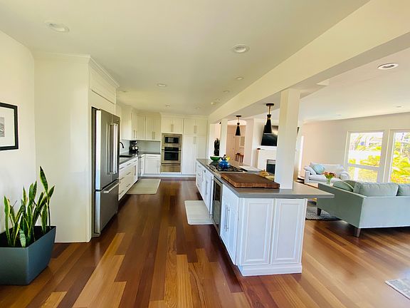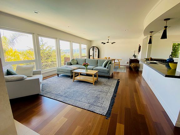 The open-concept layout integrates the living, kitchen, and dining areas, with a wall of glass framing stunning views of Mount Tamalpais. A sleek fireplace anchors the space, creating a warm and inviting atmosphere. The updated chef's kitchen is a showstopper, featuring a large quartz-topped island, gas cooktop, wine fridge, and abundant custom cabinetry perfect for entertaining or casual gatherings.